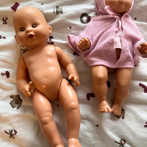 Pakken inneholder 3 dukker, samt et stort utvalg av klær i ulike størrelser, sko, luer og annet tilbehør som kleshengere, bæreveske og sengetøy. Flere av klærne og tilbehøret er fra Baby Born, mens dukkene kan være av ulike merker. Alt er pent brukt.