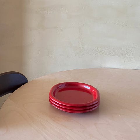 6 stk dype tallerkener er hele og blank og fin i glasuren. De har lite bruksspor, men har varierende grad av krakkelering.