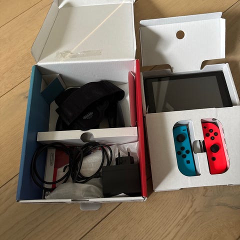 Nintendo Switch 2019 spillkonsoll med Joy-Con kontroller i rød og blå. Konsollen inkluderer også dokkingstasjon for tilkobling til TV. Passer til både håndholdt og stasjonær spilling. Kjøpt på Obs i 2023, har kvittering.