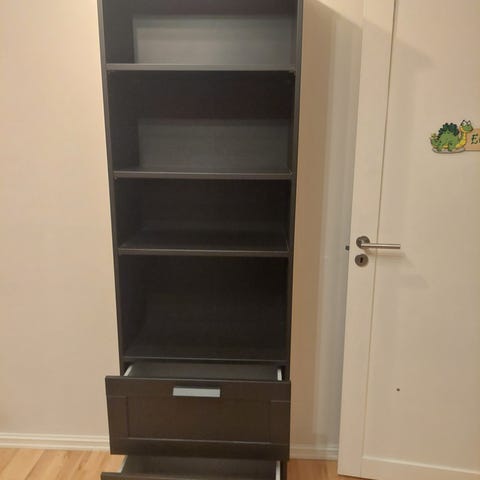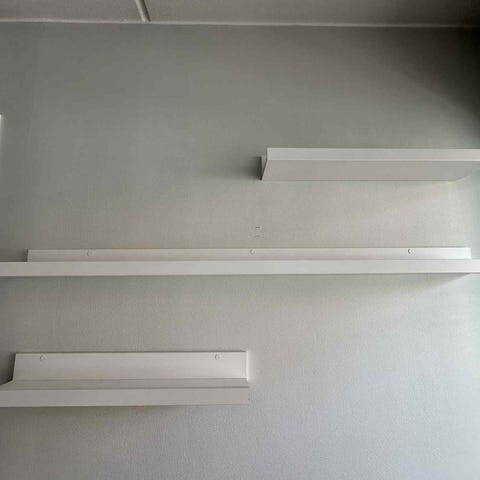 Selger to smale, hvite hyller som passer perfekt i små rom som bad, gang eller bod. Pent brukt og stabile, med flere hyller.