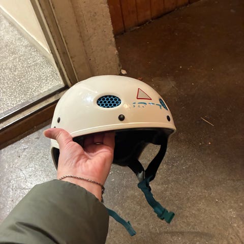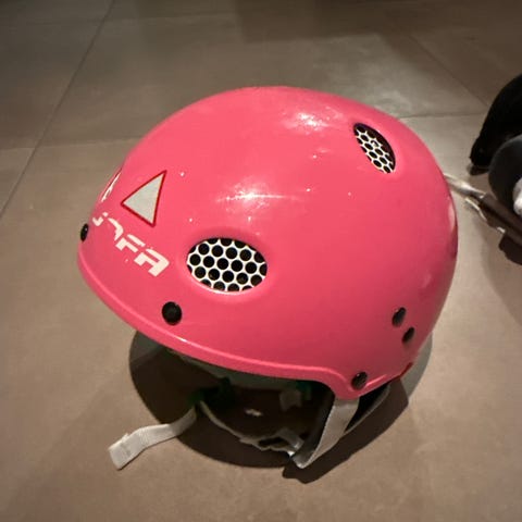 Jottnar hjelm i blå farge med ventilasjonshull og rød justerbar hakestropp. Hjelmen har polstret innside for komfort og sikkerhet.