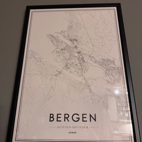 Minimalistisk kart over Bergen - 93x62cm - innrammet