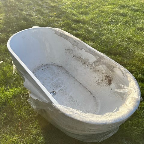 Badekar i plast med hvit farge. Har grønne bølgemønstre i bunnen for sklisikring. Egnet for bruk til bading.