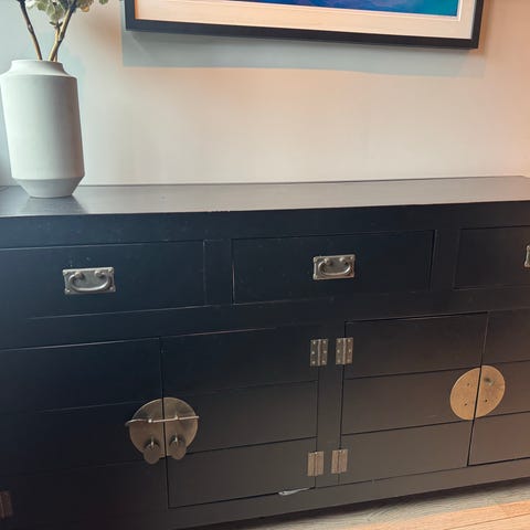 Vakker antikk skjenk i heltre, muligens mahogni eller kirsebærtre. Hyller innvendig.