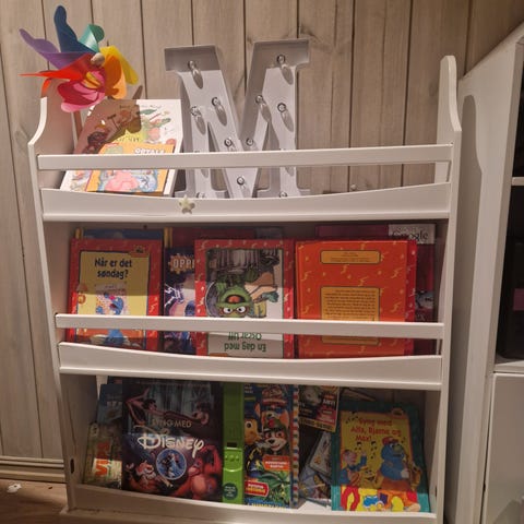 Hylle til leker/bøker. Praktisk og har mye oppbevaringsplass.