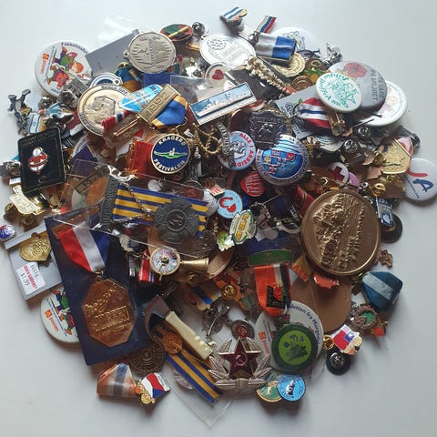 Vurder å selge: Håndlaget caps med mange forskjellige pins og merker festet på grå "OL Lillehammer" caps. Capsen har et unikt og dekorativt design med variasjon i farger og motiver på pinsene. Selges samlet.
