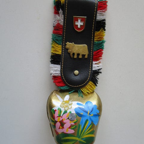 Kubjelle, sveitsisk, edelweiss, alpint, vintage, suvenir, folkekunst, messing, håndmalt, hyttepynt, samlerobjekt