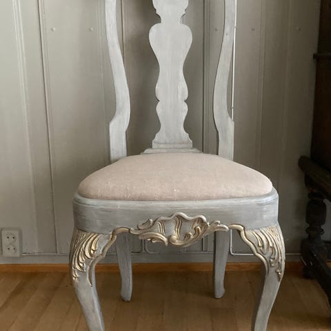 Seks franskinspirerte stoler med rotting i ryggen og fløyelsstoff på setene. Tre i mahogni eller kirsebær (?). Noe slitt, men kan bli supre med litt kjærlighet.