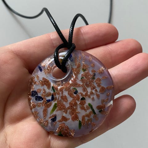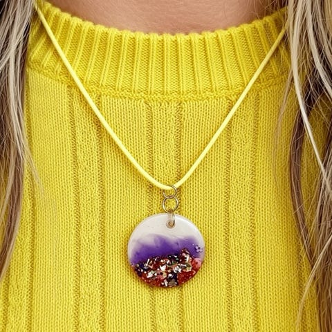 & Other Stories dame halskjede laget av andre materialer. Halskjedet har en rund anheng med rosa og lilla farger og et mønster av sommerfugler. Designet er enkelt og passer for dame.