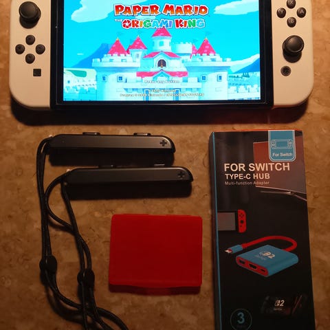 Følger med helt ny praktisk mini dock stasjon, Joy con straps, game card og Paper Mario: The Origami King spill.