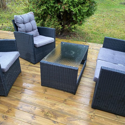 Spisegruppe med bord og fire stoler med puter. Putetrekkene kan vaskes i maskin. Kjempefine og solide møbler som er pent og lite brukt. Har stått under trekk når de ikke har vært i bruk. Trekket kan følge med. Selges grunnet flytting.