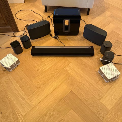 Kombinasjonen av Arc + Sub Gen 3 gir et deilig og presist lydbilde med kraftig, kontrollert bass, mens Sonos Five tilfører tyngde og dynamikk. One SL brukes som dedikerte surroundkanaler for et komplett lydbilde.