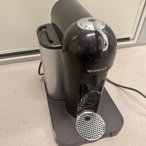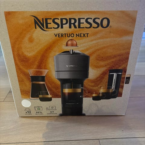 Nespresso kapselkaffemaskin i svart farge. Maskinen er designet for å bruke kaffekapsler og har et kompakt og moderne utseende. Passer til hjemmebruk for enkel og rask brygging av kaffe.
