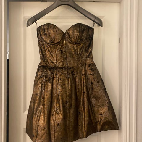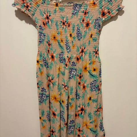 Blått med blomster: Strikk i livet, knapper i siden - nederste knapp kan kneppes opp. Splitt - pent brukt