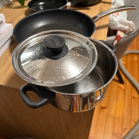 Selger 3 stekepanner, en i jern, en vanlig stekepanne i teflon og en pannekakepanne.
