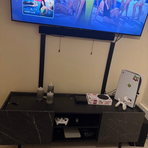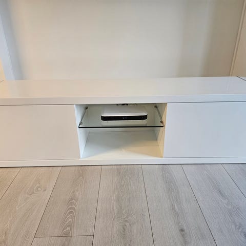 Veldig pent brukt TV-benk. Selges da den er for stor for stua vår. Er kun ett bruksmerke - som vist på bildet, dette er sånn den kom da vi kjøpte de, men siden det var så lite gadd vi ikke gjøre noe med det.