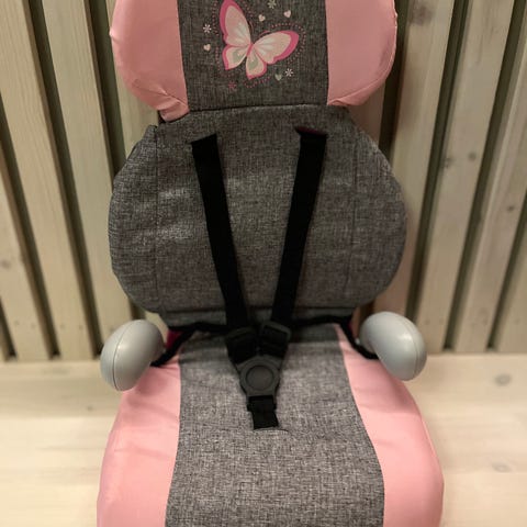 Baby Born barnestol med brett i rosa og hvit. Stolen har en sikkerhetssele og er designet for barn. Materialet er plast og den har en stabil base for trygg bruk.
