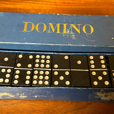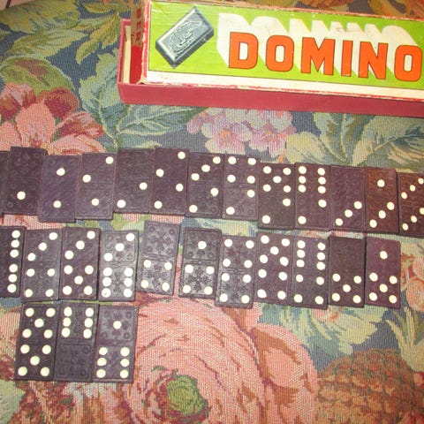 Dominobrikkene er laget av svært tykk og solid papp, og selv om settet er godt brukt, er det fortsatt rikelig med spilletid igjen. Illustrasjonene er nydelige og viser blant annet epler, hjerter, fugler og hus, som skal matches.