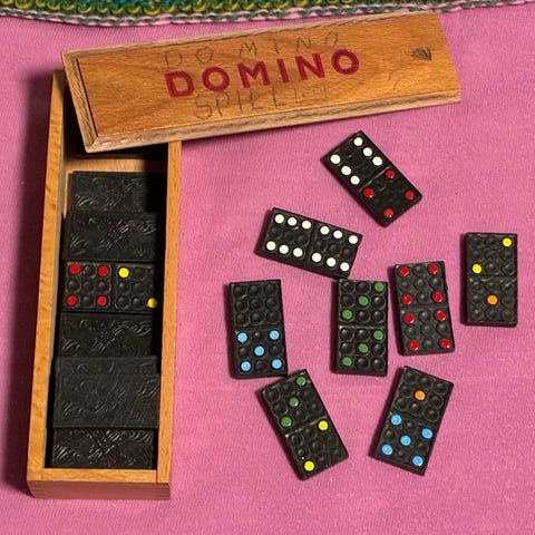 Selger et sjarmerende retro Merit Picture Dominoes, et klassisk pedagogisk dominospill med illustrasjoner i stedet for prikker. Spillet er et pedagogisk domino som kan brukes til å lære mønstre og bilder.