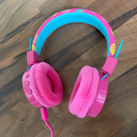 Bluetooth trådløse hodetelefoner for barn fra Senz selges. Oppladbar versjon, USB kabel kan følge med om ønskelig. Lilla og hvit farge med rosa detaljer.