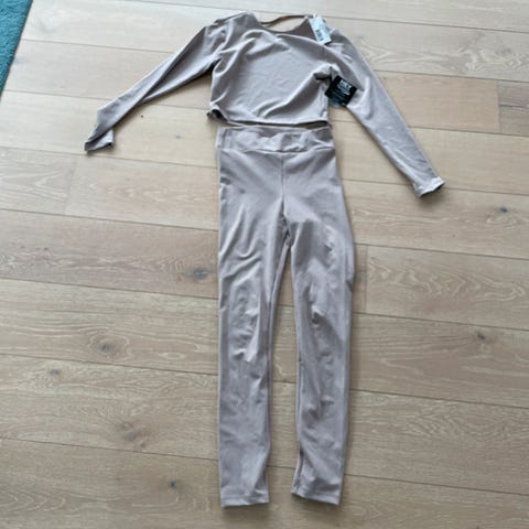 treningssett i størrelse XS for kvinner, laget av bomull. Settet består av genser og bukse i brun farge.