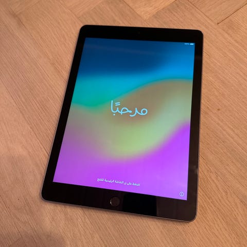 Apple iPad med 32 GB lagringskapasitet. En nettbrett med berøringsskjerm og hjemknapp. Leveres med beskyttende deksel som har håndstropp for bedre grep. iPaden er generasjon 6 og har noen bruksmerker. Fargen på selve iPaden er sølv, men med et svart deksel
