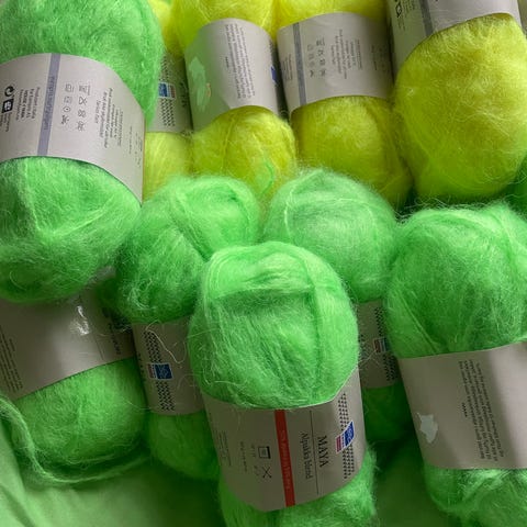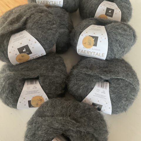 House of Yarn garnnøster fra strikkemekka med oppskrift. De grå garnene er til et teppe, og de blå skal være til en cardigan.
