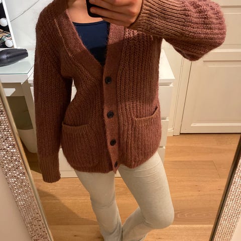 Strikket cardigan i mykt og deilig Dale garn i ull🤎 Aldri brukt, kun prøvd på for bildene her. Oversized, god passform og passer alt fra en S-L. For ref. er jeg en strl M og er 163 cm høy. Langermet med knapper foran. Håndstrikket.🧶