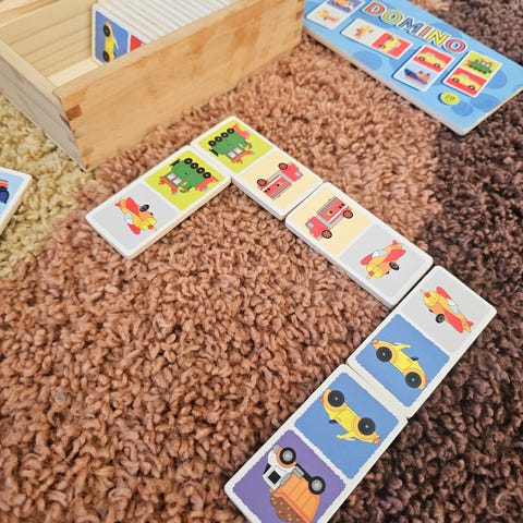 Små dominobrikker med morsomme og enkle illustrasjoner som hjelper barnet med å utvikle evnen til observasjon og gjenkjenning. Spillet er spesielt utviklet for små barn og stimulerer nysgjerrighet og læring gjennom lek.