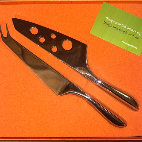 Den brede kniven har hull for å unngå at osten skal klebe seg.