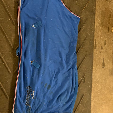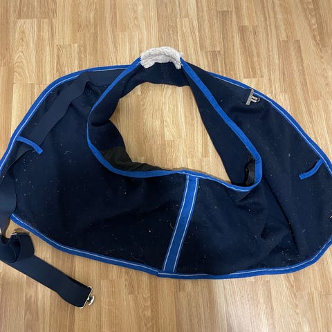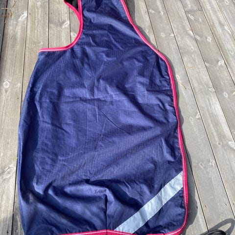 Fleecedekken med hals… str135. Et par små hull…. Ingenting å si for bruken. Ikke vasket
