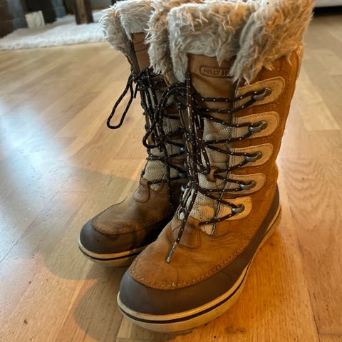 Selger skinn Helly Hansen barnestøvler fôret for jente i str 36. Støvlene brukt bare inne på skolen men lite, det må limes på utesålen, for noen få kr eller gratis så klart hel og finn foresten.