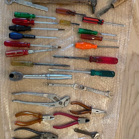 All round verktøy, Div. Skrujern, Div. Pipenøkkel, Dor, liten hammer.
