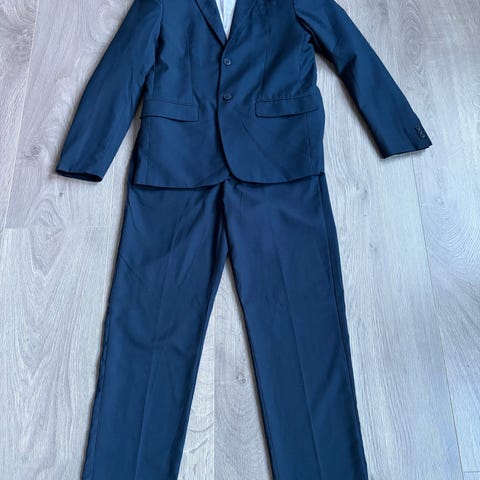 Selger en mørkeblå pendress, som kun har vært brukt en gang. Kjøpt ny i august og selges pga for liten. Ingen skader og fremstår som ny. Består av dressbukse, jakke og kortermet hvit skjorte.