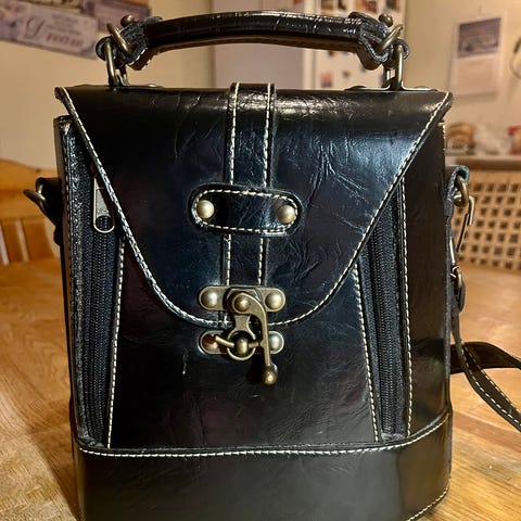 Liten, men innholdsrik med flere rom, plass til bankkort, eget rom med glidelås innvendig, samt utvendig bak.