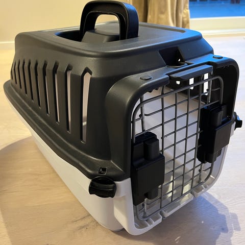 Ønsker å gi bort et lite kattebur. Det er svært pent brukt, men klemmene på sidene sitter så hardt at det er vanskelig å ta av toppen. Har du en katt som er lett å få ut av buret så har ikke dette noe å si for bruken.