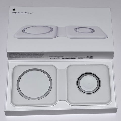Apple MagSafe Duo Ladestasjon i hvit farge. Designet for trådløs lading av kompatible enheter som iPhone og Apple Watch. Kompakt og sammenleggbar design for enkel transport og oppbevaring. Leveres med ladekabel.