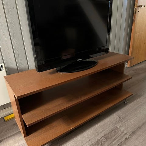 Ikea Lack tv-benk til salgs. Er godt brukt og har bruksmerker på bena som er vist på bilder. Svart ytterlsg har prellet av. Er en slak svai på den nær midten, men tror dette rettes opp med stenger som vist i bildet.