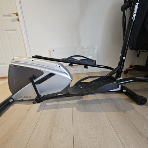 X-trend LE-9000i ellipsemaskin med digitalt display og flere treningsprogrammer. Maskinen har justerbare motstandsnivåer og ergonomisk design for hjemmebruk.
