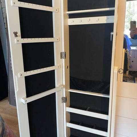 Smykkeskap med speil selges. Speilet er 110 cm høy og hele skapet er 145 cm høy.