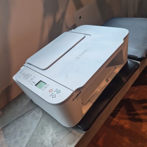 Canon MP495 multifunksjonsskriver med funksjoner for utskrift, skanning og kopiering. Enheten er svart og har knapper for valg av svart-hvitt eller fargeutskrift, samt forskjellige papirstørrelser inkludert A4 og 10x15 cm fotopapir.