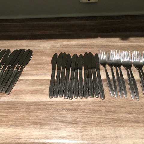 Bestikksett i rustfritt stål som mangler noen deler. Rydder i ting fra foreldre og selger derfor rimelig. Inkluderer skjeer, gafler, kniver og teskjeer, egnet for daglig bruk.
