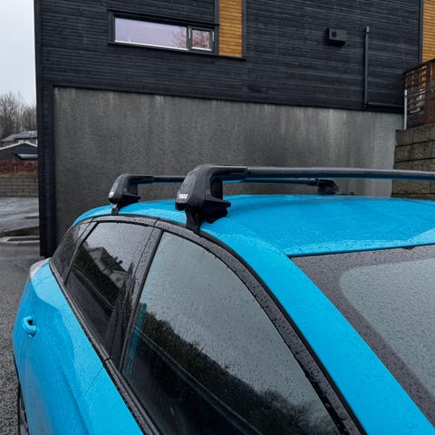 Komplett med wingbar stativ og Thule fester nøkkel til boks og stativ.