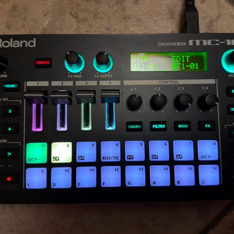 Roland MC-707 Groovebox musikkproduksjonsenhet med flere faderkontroller, fargede pad-taster, og ulike innganger og utganger for lyd og MIDI. Enheten har et digitalt display og er designet for elektronisk musikkproduksjon og live opptredener. Har knapt blitt brukt. Oppgradert med siste software. Sendes i original eske med tilbehør.