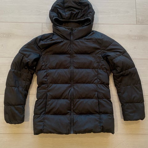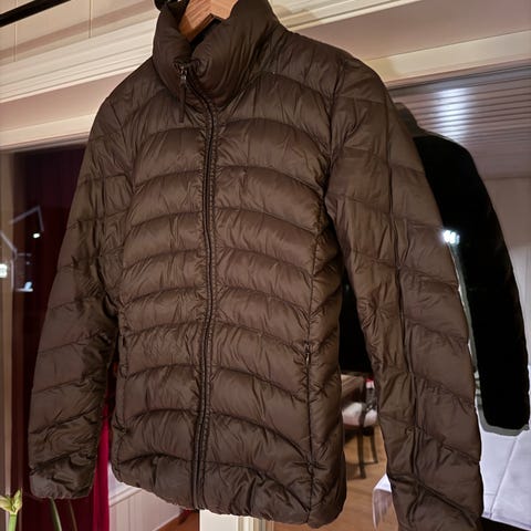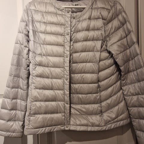 Uniqlo tynn dunjakke i størrelse L for damer. Jakken er rosa og laget av dun, noe som gir varme og isolasjon. Perfekt under en kåpe om
