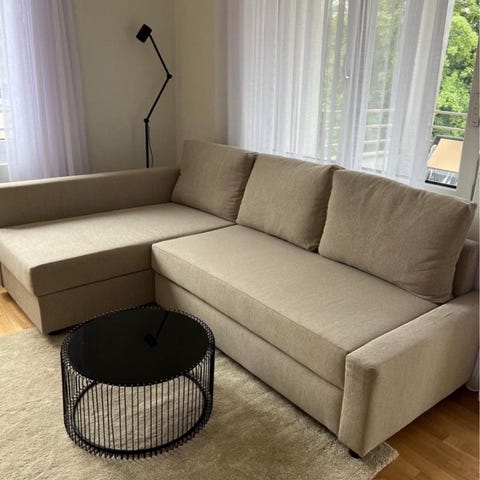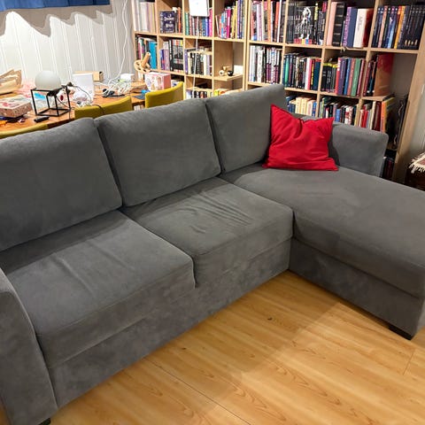 Sovesofa fra Ikea selges billig grunnet noen flekker på trekket + litt ødelagt trekk på siden