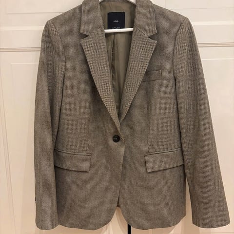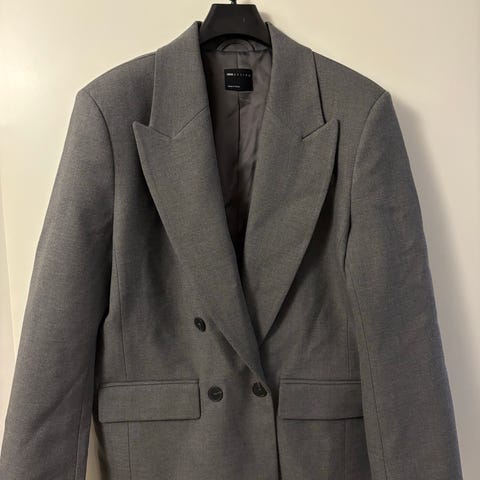 Mango blazer i størrelse XL for kvinner. Jakken er grå og laget av polyester. Den har en dobbeltradet knappelukking og knappedetaljer på ermene. Med innebygde skulderputer.