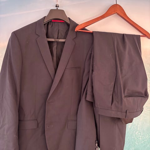 Hugo Boss mouline strech i størrelse 50. laget av polyester, ull og elastan. Jakken er blå med hvite detaljer på krage og lommer. Den har en knappelukking og er designet for menn. Den er kun blitt brukt 1 gang.