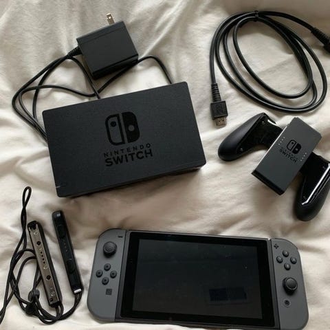 Nintendo Switch konsoll med fargede Joy-Con-kontrollere i blått og rødt. Bærbar spillkonsoll med berøringsskjerm og mulighet for tilkobling til TV. Passer for ulike spillere og spilltyper.