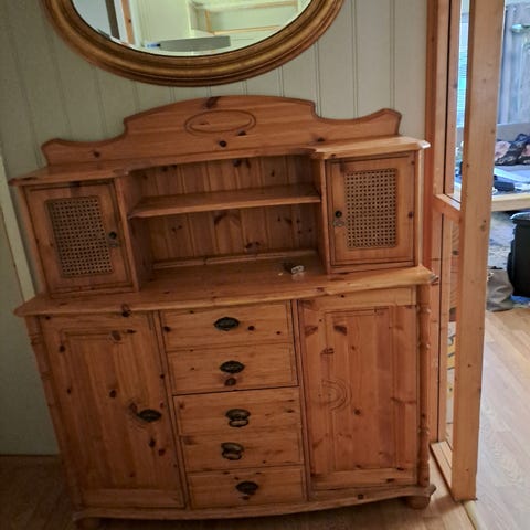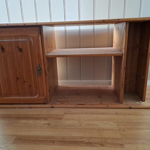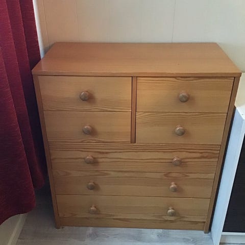 Liten kommode og gulvteppe gies bort mot henting. Skade i nederste skuffe, ellers grei.